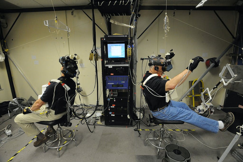 Astronautit Tom Marshburn ja Dave Wolf harjoittelevat avaruuskävelyä virtuaalitodellisuudessa. Lähde: Wikimedia/Creative Commons